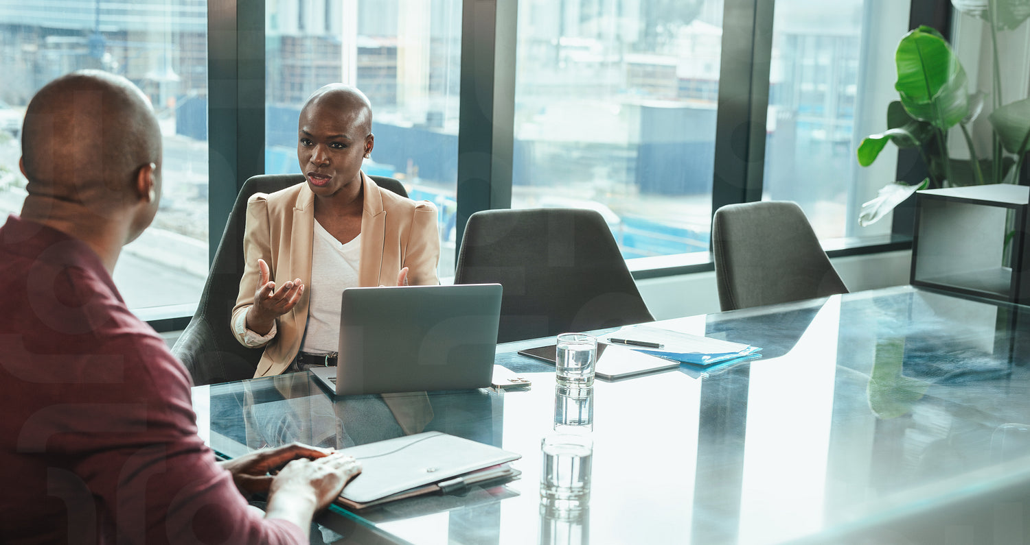 African businesswoman discussing plans with a colleague in a corporate office