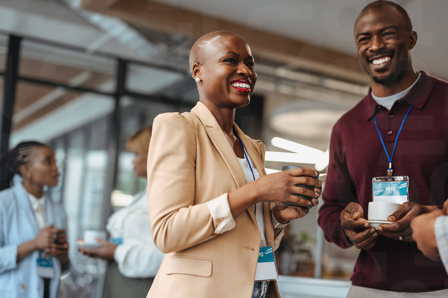Successful business people networking while enjoying a casual coffee break at a conference. They are exchanging ideas with warm, genuine smiles, promoting a positive work culture and collaboration.
