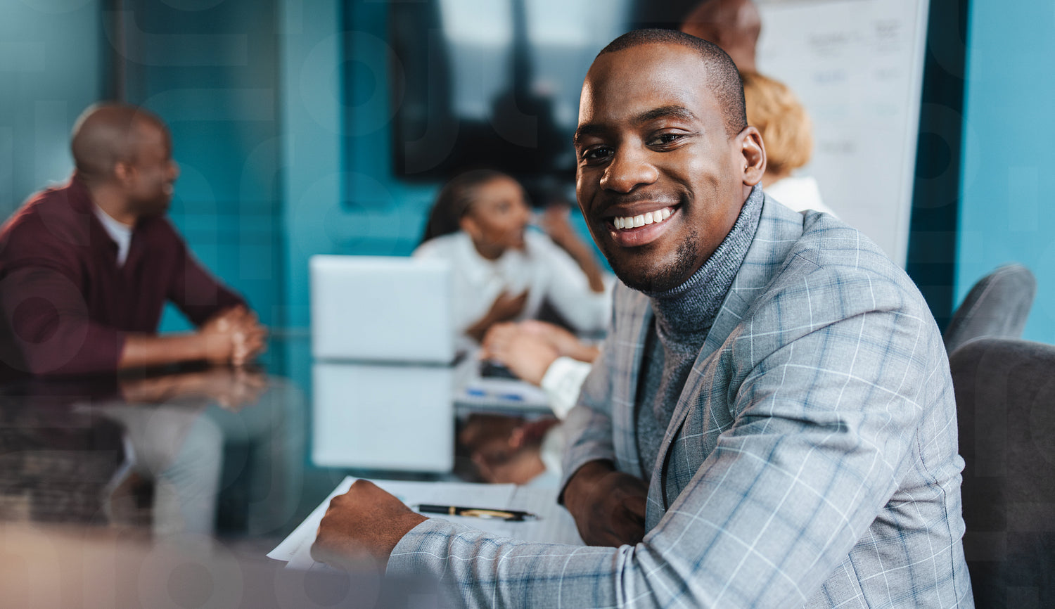 Young professional smiling and looking at camera in a successful business meeting