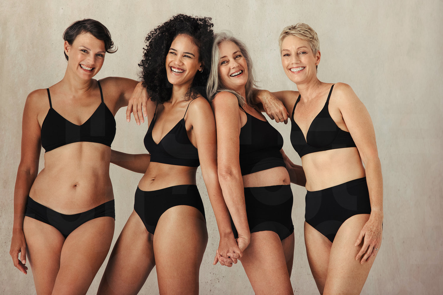 Different women of all ages celebrating their natural and aging bodies. Four confident women smiling cheerfully while wearing black underwear and standing together against a studio background.