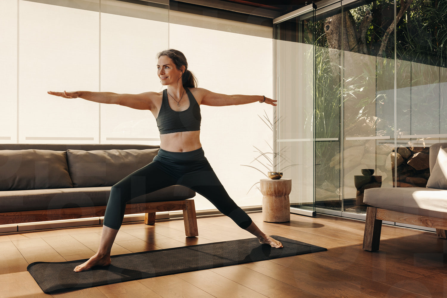 Mature woman doing the warrior pose during yoga