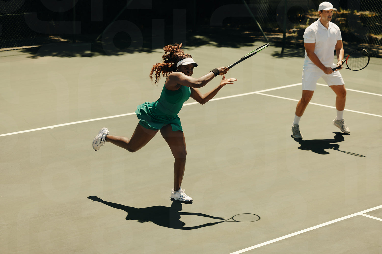 Dynamic action shot of a woman and man playing together tennis, swinging rackets on an outdoor court.