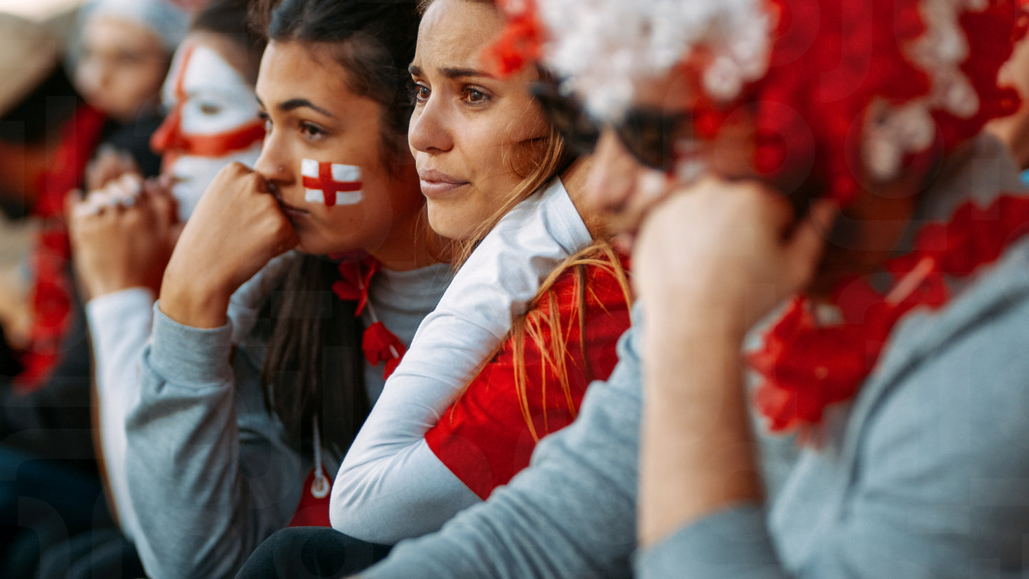 Disappointed fans at sports stadium watching the game in disbelief while their team is losing the match. Upset group of English fans looking sad after football team failure in international sport event.