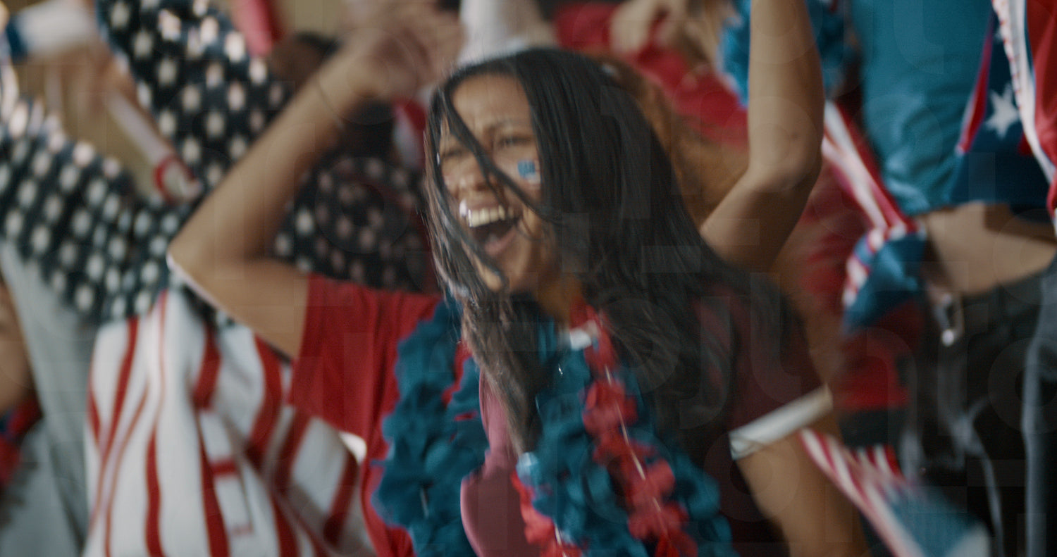 Excited fans with US flag in sports crowd celebrating a game win. American soccer fans cheering over a goal.