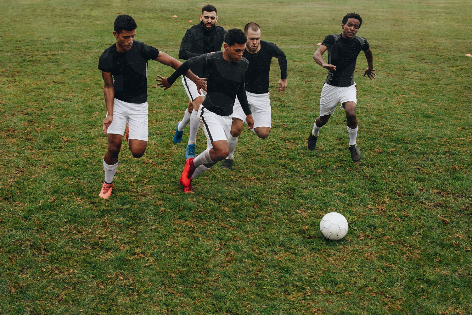 Group of men playing football on the field running for the ball. Soccer players running on field for possession of the ball.