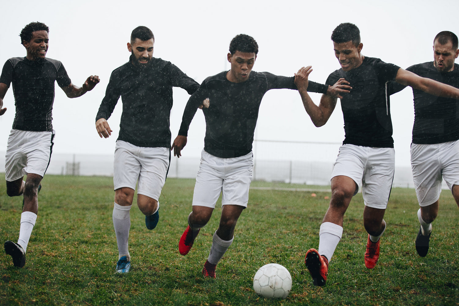Men playing soccer running after a football on a rainy morning. Footballers trying to take possession of the ball running on the field playing soccer.
