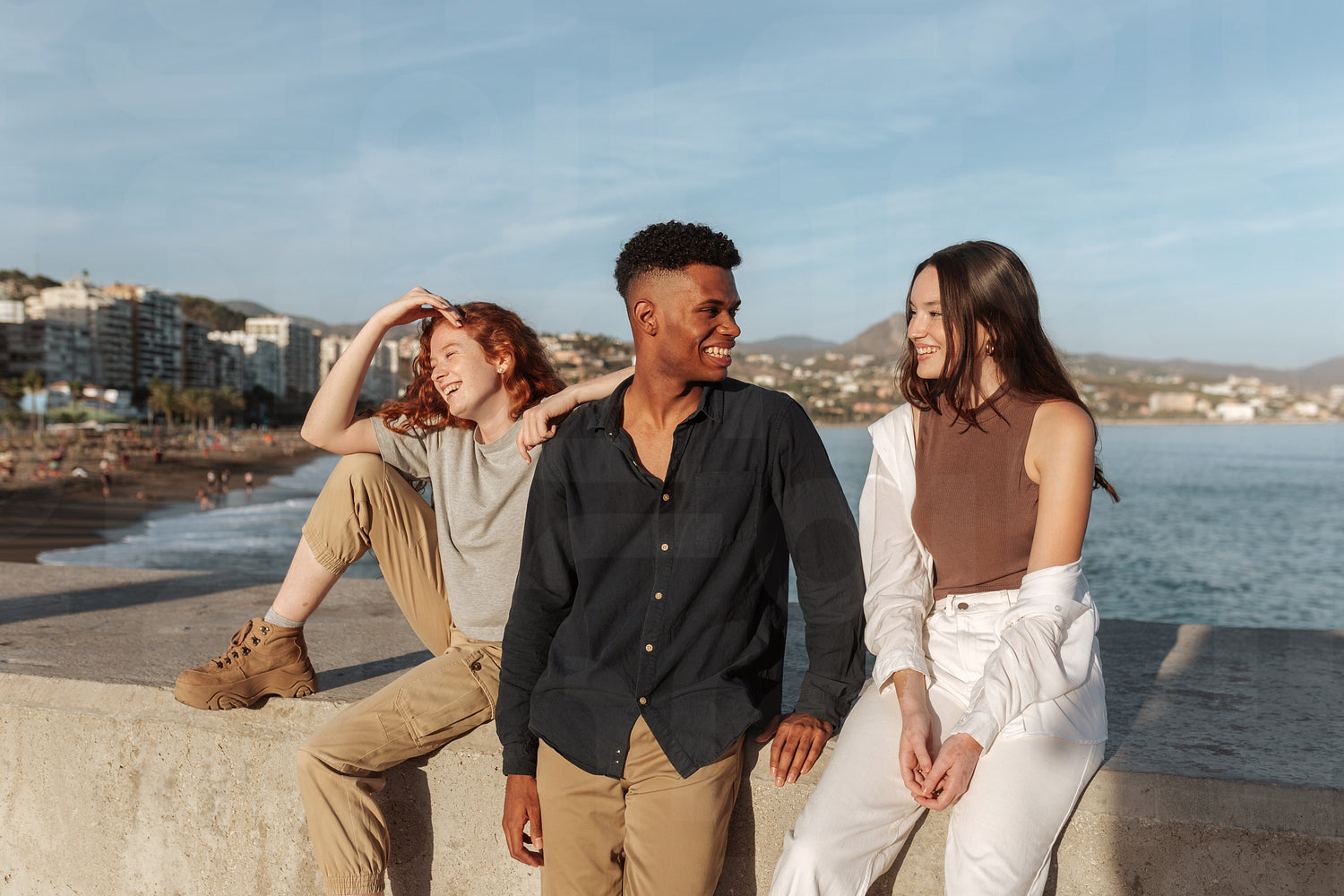 Group of happy young friends relaxing on a wall by the seaside. Three multicultural friends laughing and having a good time next to the sea. Cheerful young people hanging out together on the weekend.