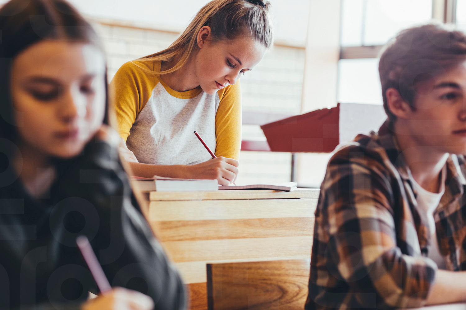 Teenage girl sitting at her desk in high school classroom writing in a notebook. Female student making notes during lecture in school.
