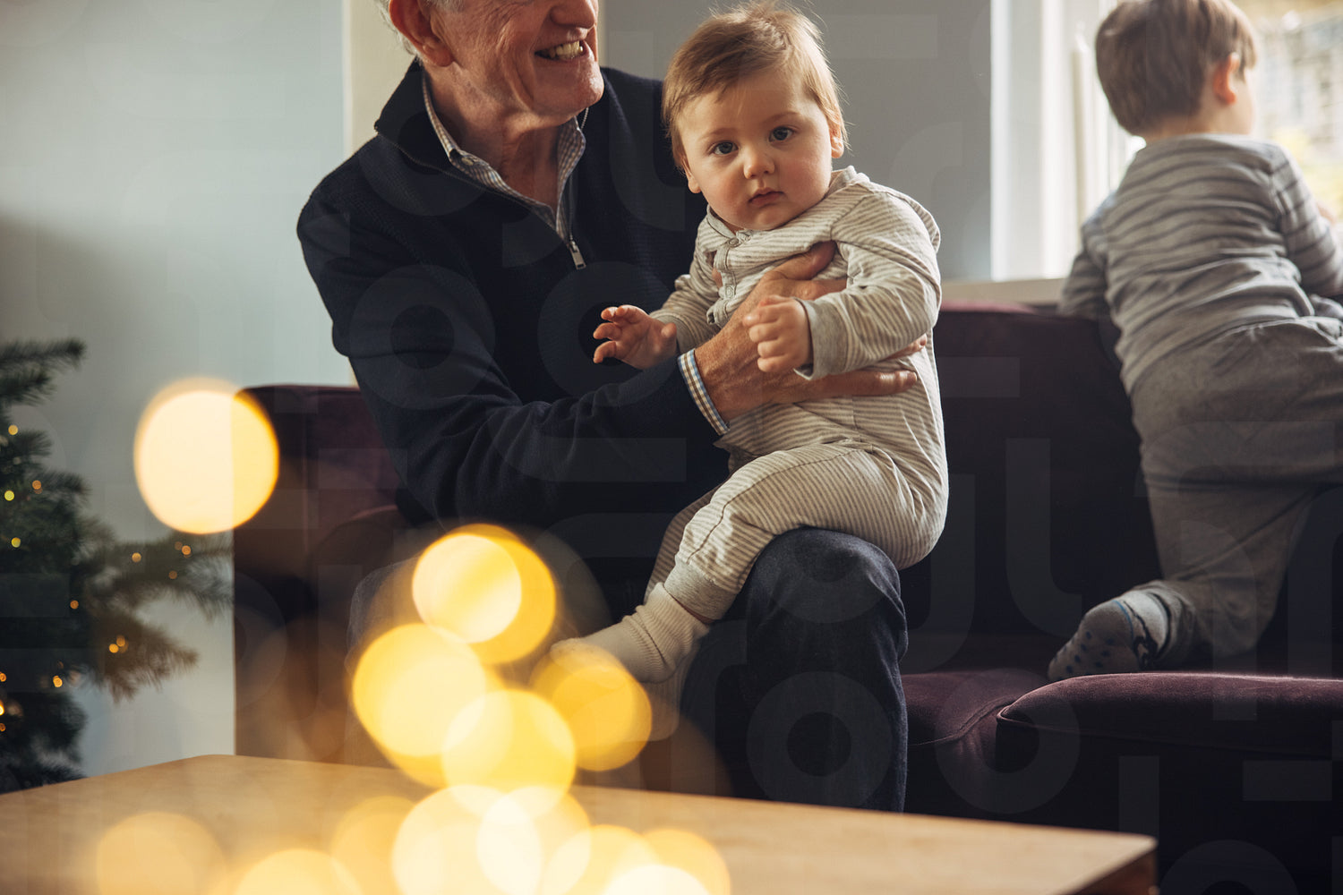 Baby boy with sitting on lap of his grandfather on sofa. Kids with grandparents at home during Christmas.