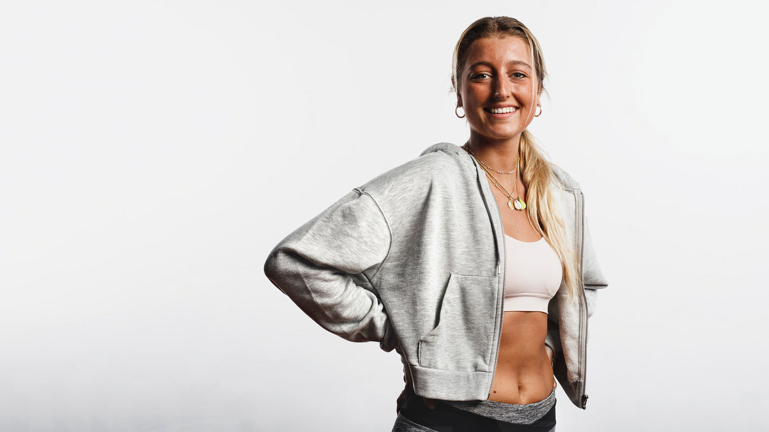 Portrait of smiling fitness woman standing against white background with hands on waist. Smiling female athlete with a tanned skin looking at camera.