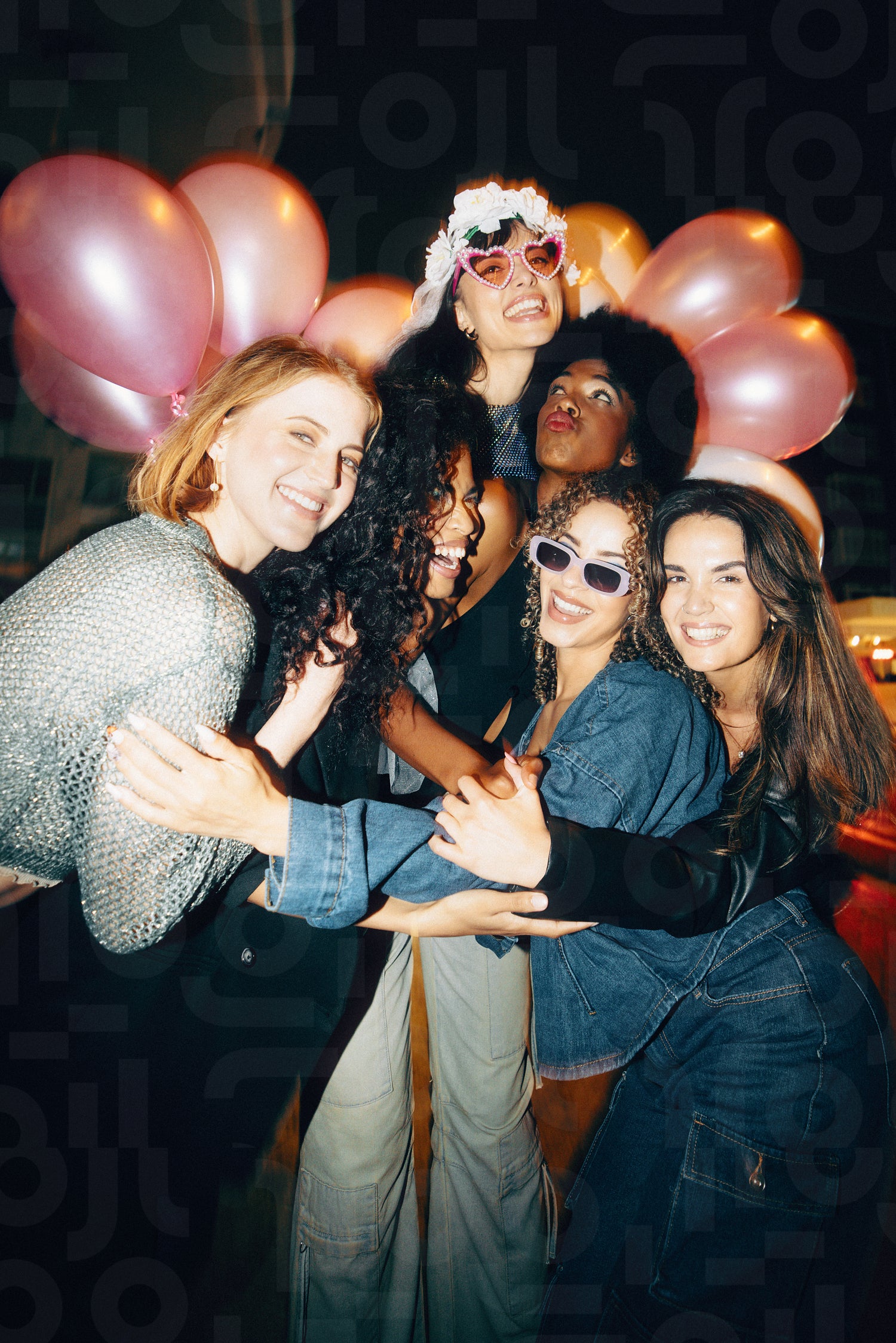 A vibrant group of friends enjoys a night celebration outdoors with colorful balloons and fun party accessories like sunglasses and a floral crown. This photo has intentional use of 35mm film grain.