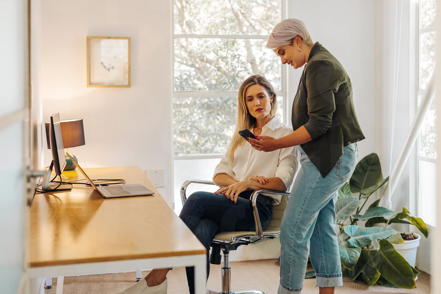 Young businesswoman showing her colleague her smartphone screen in a modern office. Two young businesswomen collaborating on a new task in a woman-owned company.