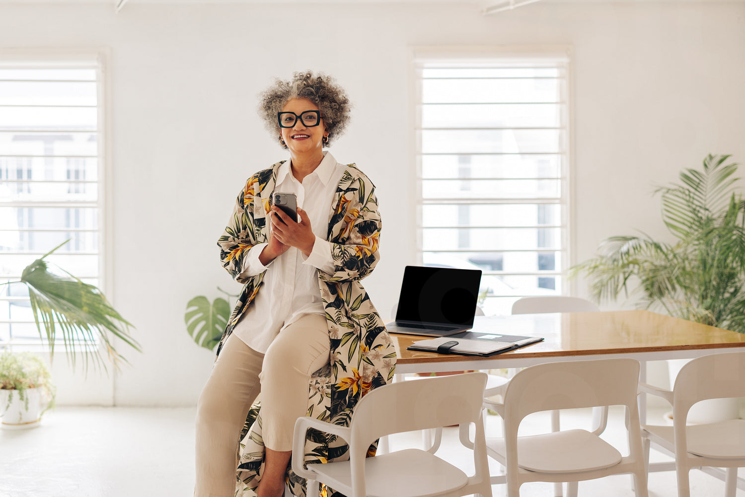 Happy senior businesswoman smiling at the camera while holding a smartphone in a boardroom. Cheerful businesswoman waiting for a meeting in a modern workplace.