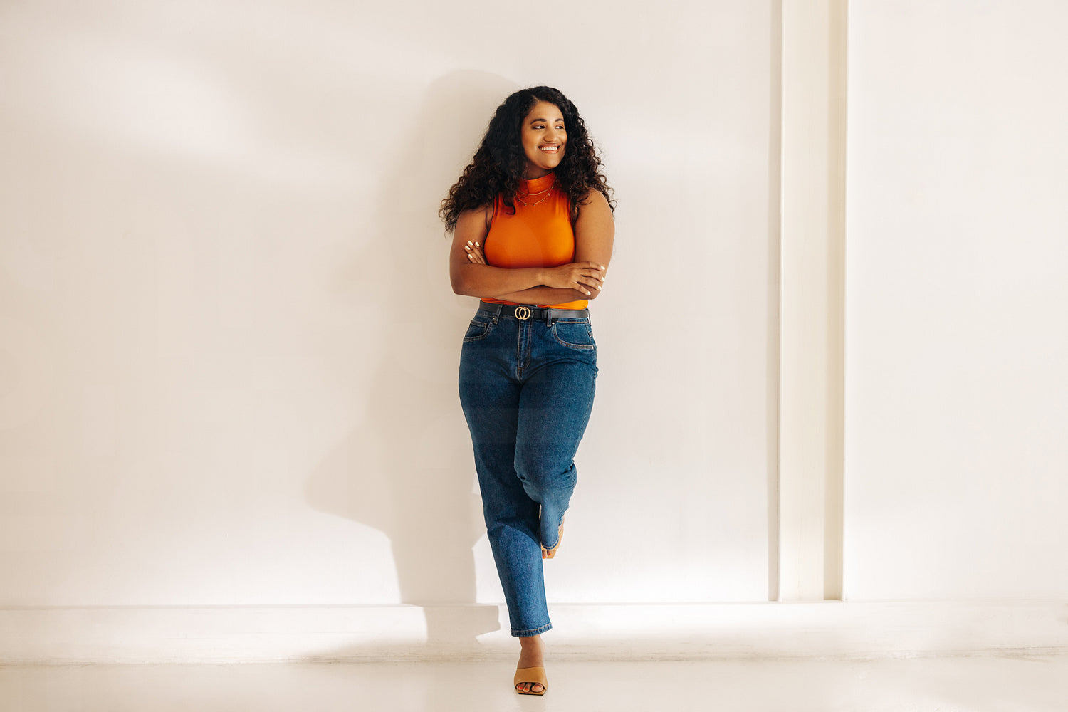 Happy young businesswoman looking away with a smile while standing with her arms crossed. Cheerful young businesswoman standing against a wall in a modern workplace.