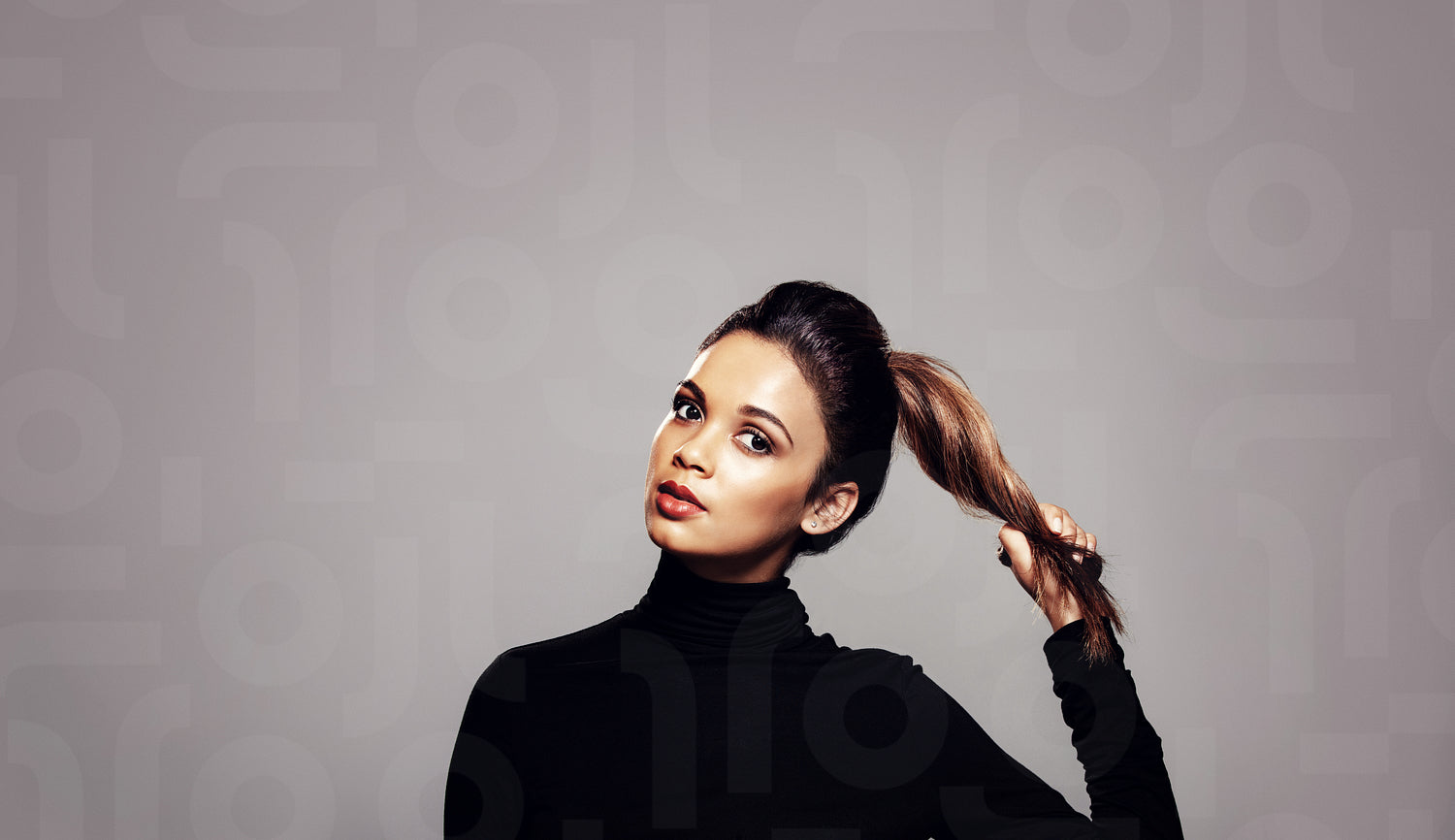 Strong healthy hair. Beautiful young woman holding her ponytail over grey background.