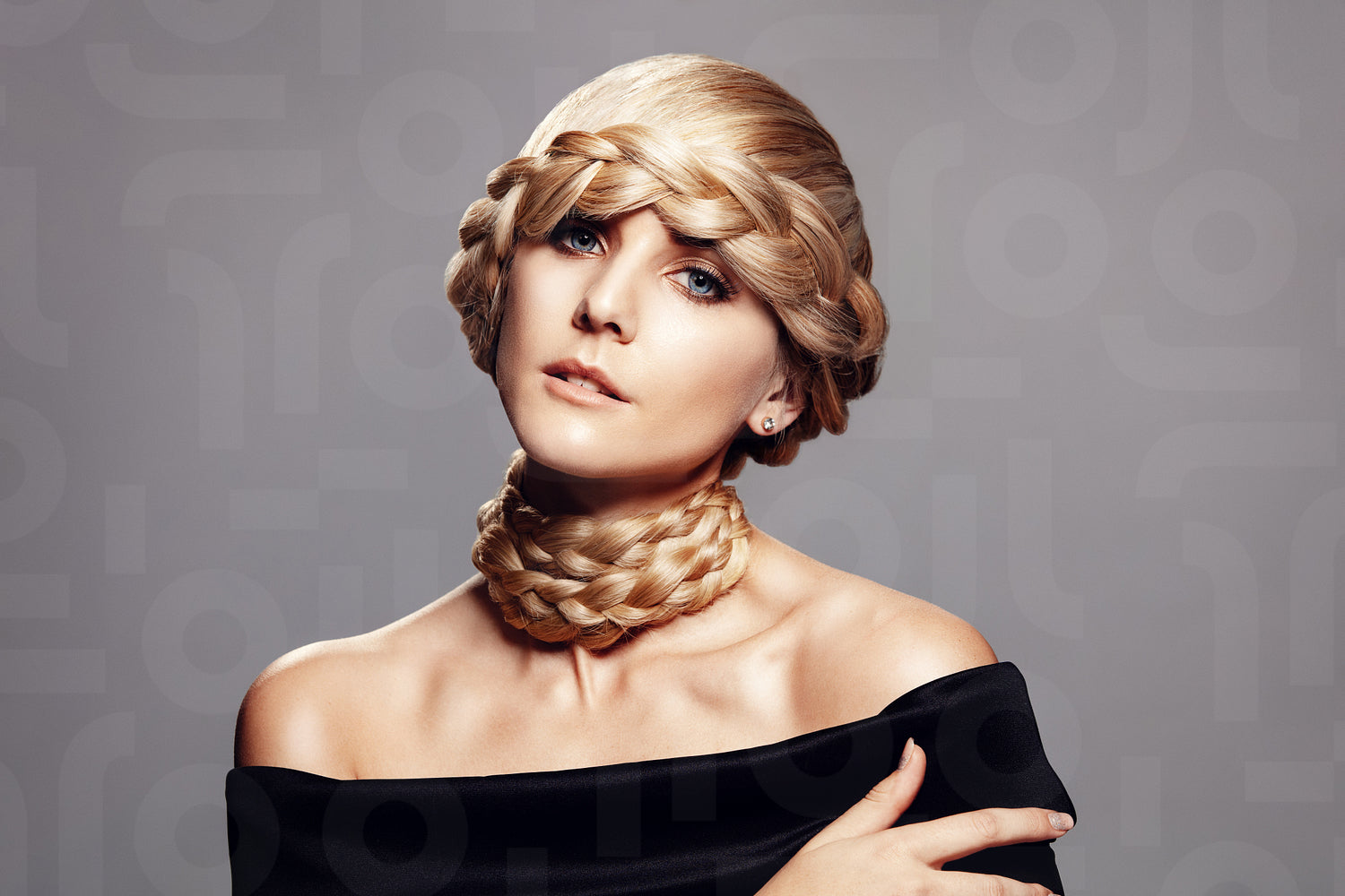 Portrait of beautiful young woman with creative braid hairdo. Stylish female fashion model against grey background.