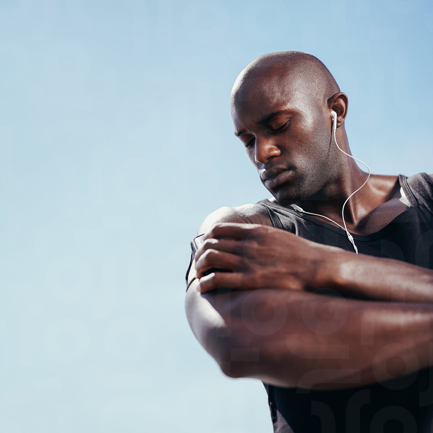 African muscular man listening to music on mobile phone