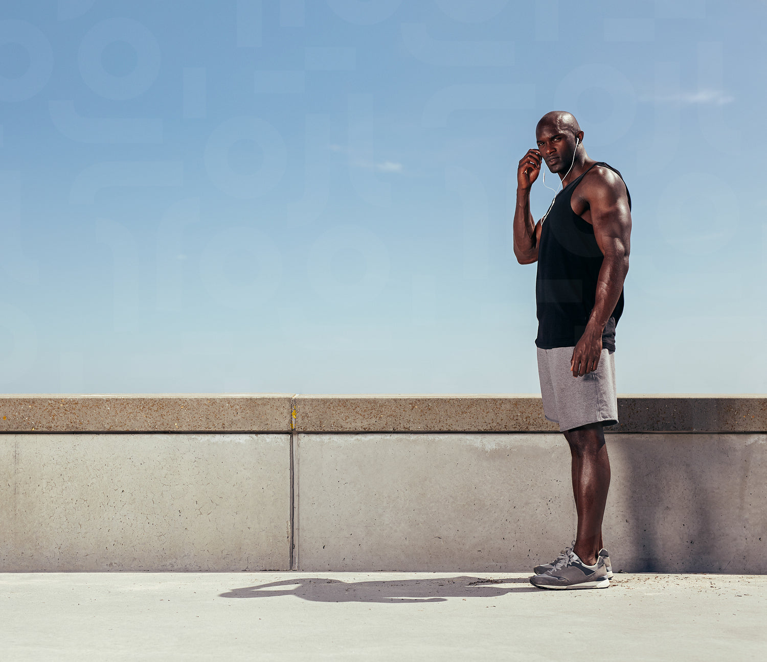 Portrait of fit young man standing on a walkway looking at camera. African fitness model wearing earphones.