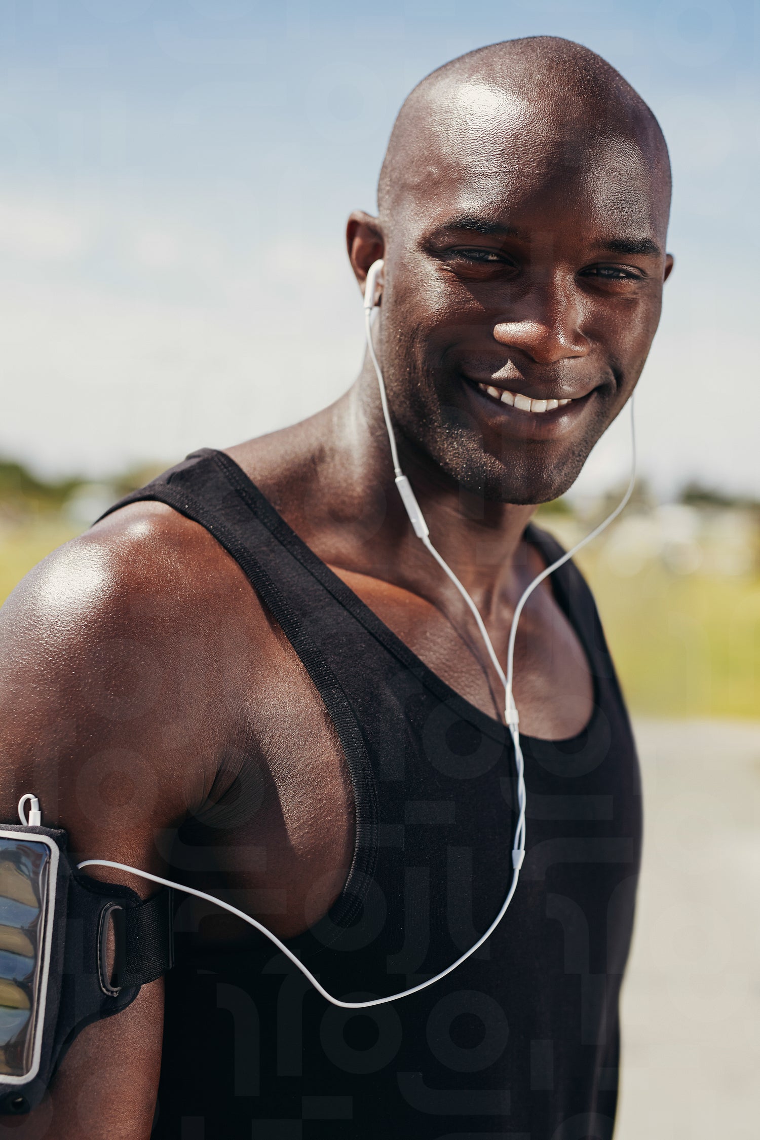 Image of happy young man wearing earphones looking at camera smiling. Fit young african male model outdoors. Muscular male runner outdoors.