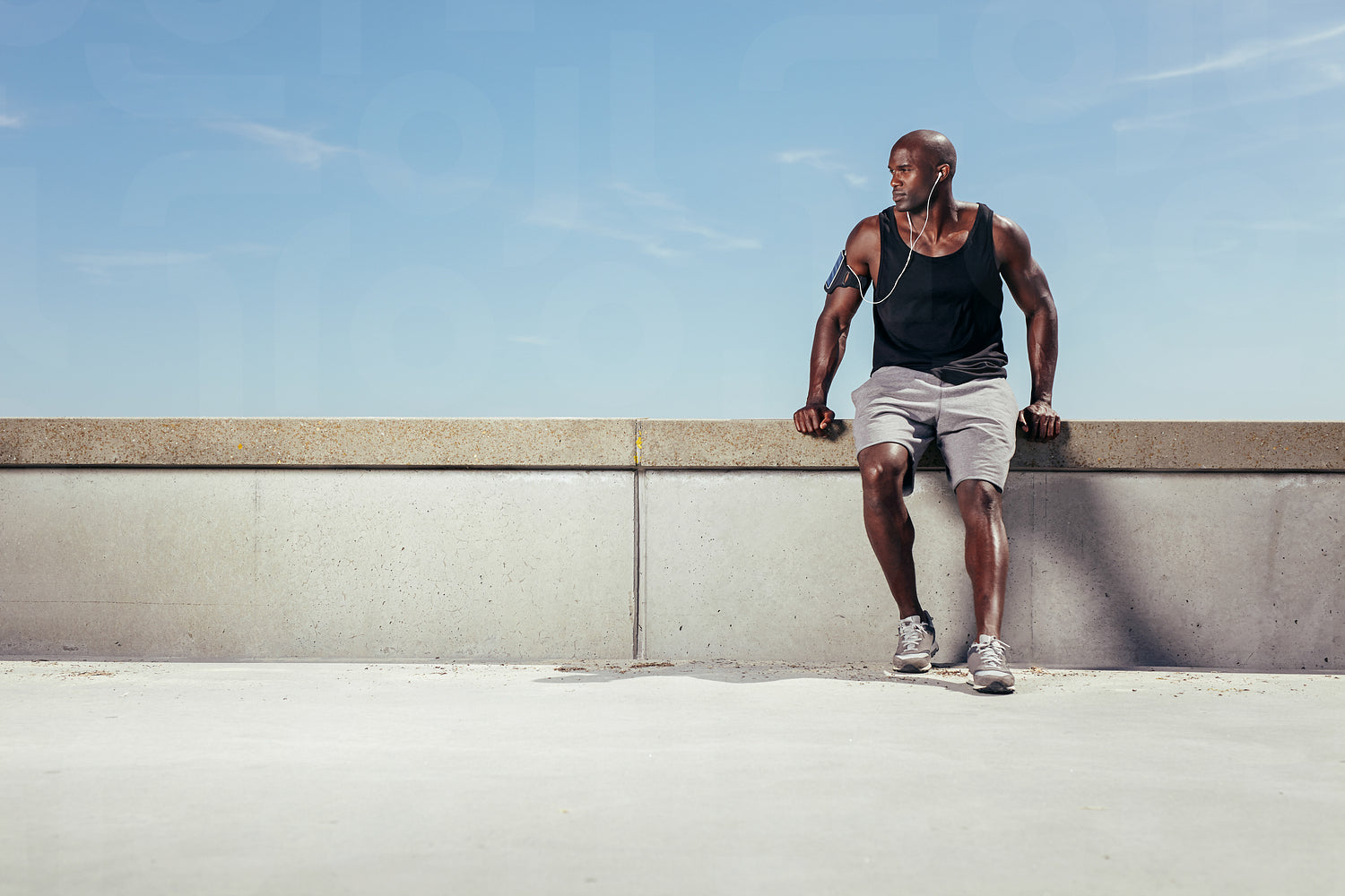 Muscular young man relaxing on embankment looking away copyspace. African male athlete wearing earphones outdoors. Male runner relaxing.