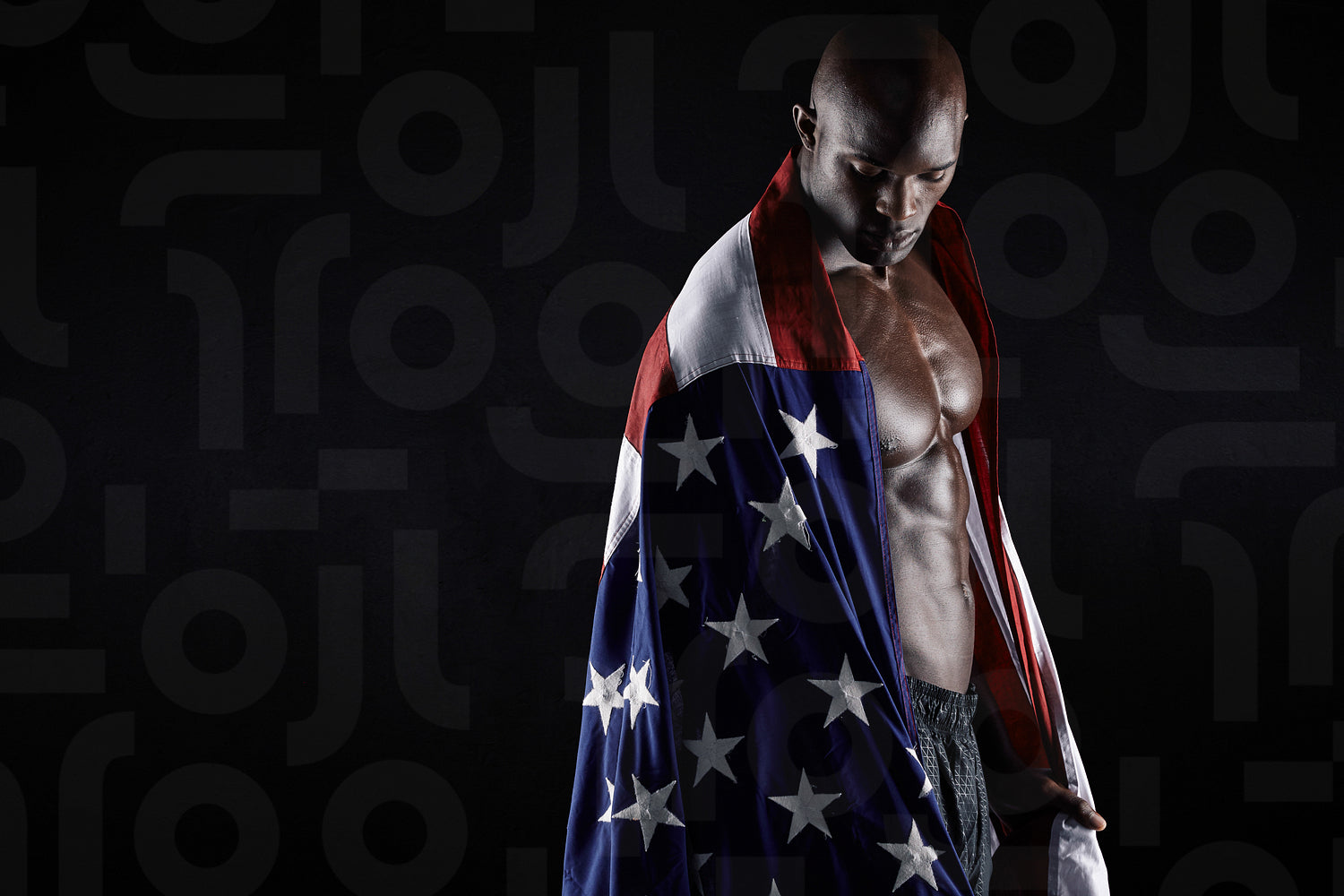 Portrait of muscular man wrapped in the American flag with copy space on black background. African athlete with country flag.