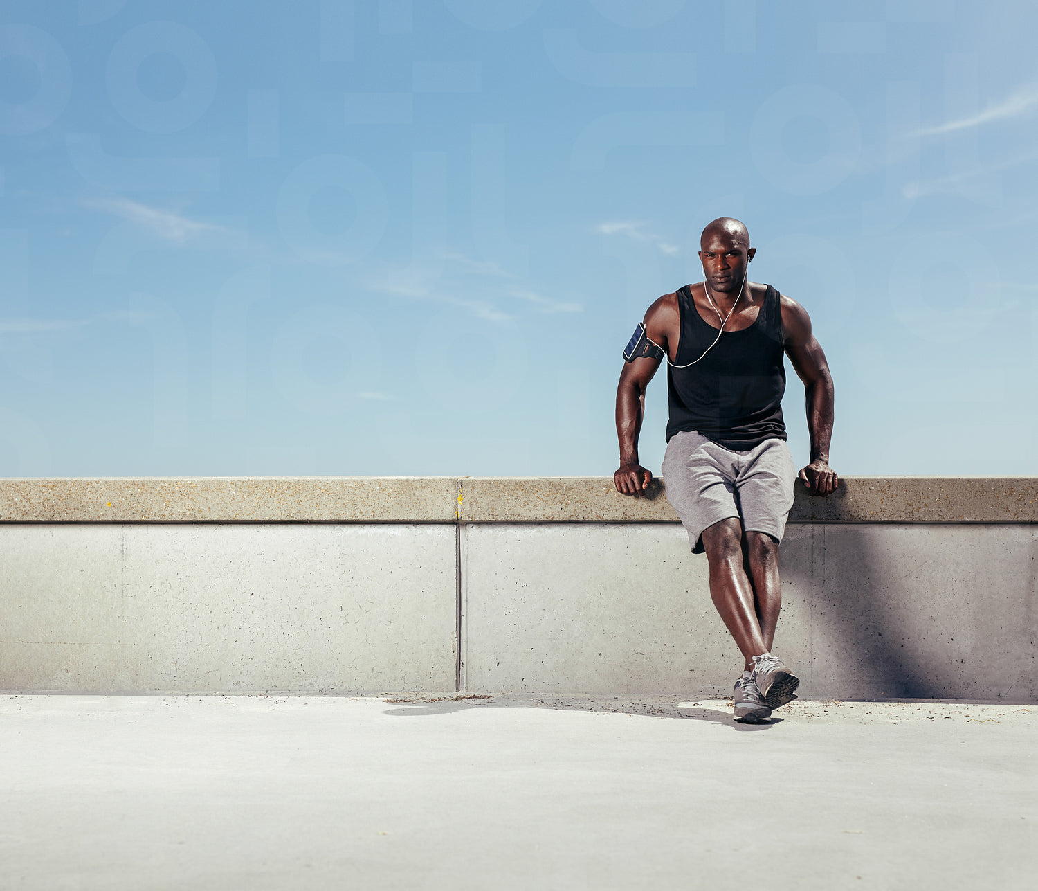 Image of fit young man relaxing on embankment after his run against blue sky. African male athlete outdoors with copyspace.