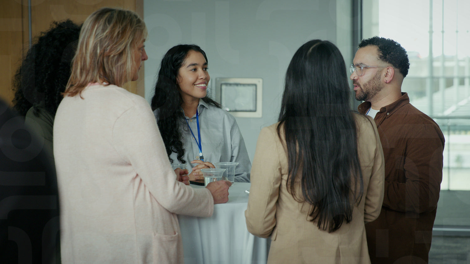 A group of professionals engage in conversation and networking at a conference or business event. They are smiling and interacting, fostering connections in a pleasant atmosphere.