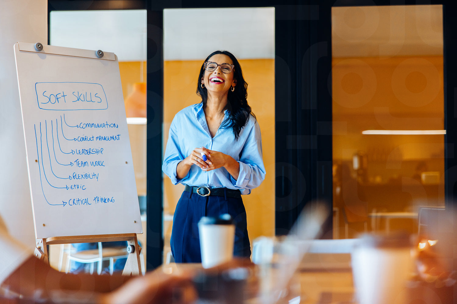 A professional woman leads a presentation on soft skills development, emphasizing communication, leadership, and critical thinking, in a conference room with an audience paying close attention.