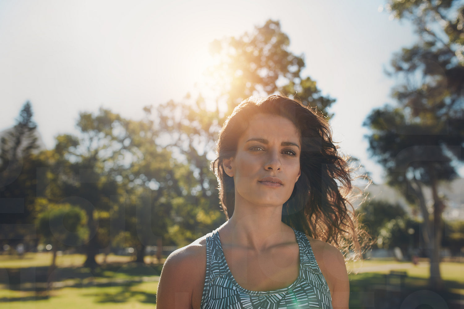 Close up shot of beautiful fitness woman in the park. Confident young middle eastern woman in sportswear taking a break from workout session outdoors.