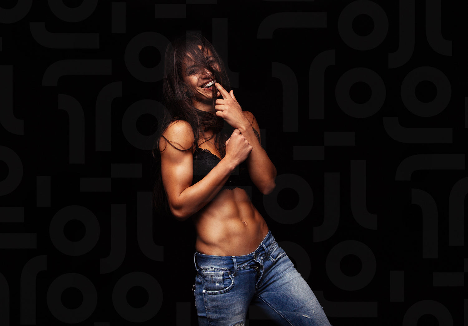 Portrait of happy young woman standing against black background. Female model posing in bra and jeans. Funny woman biting her finger.