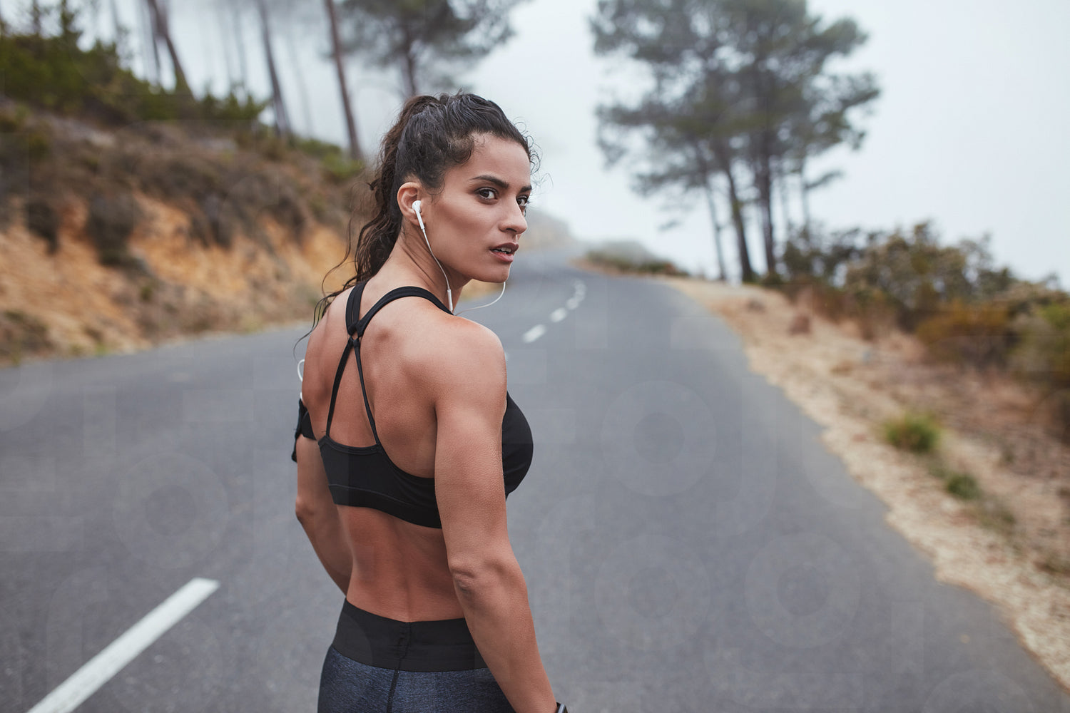 Muscular young woman in sportswear standing on a road and looking over her shoulder. Female runner on country road during outdoors training session.
