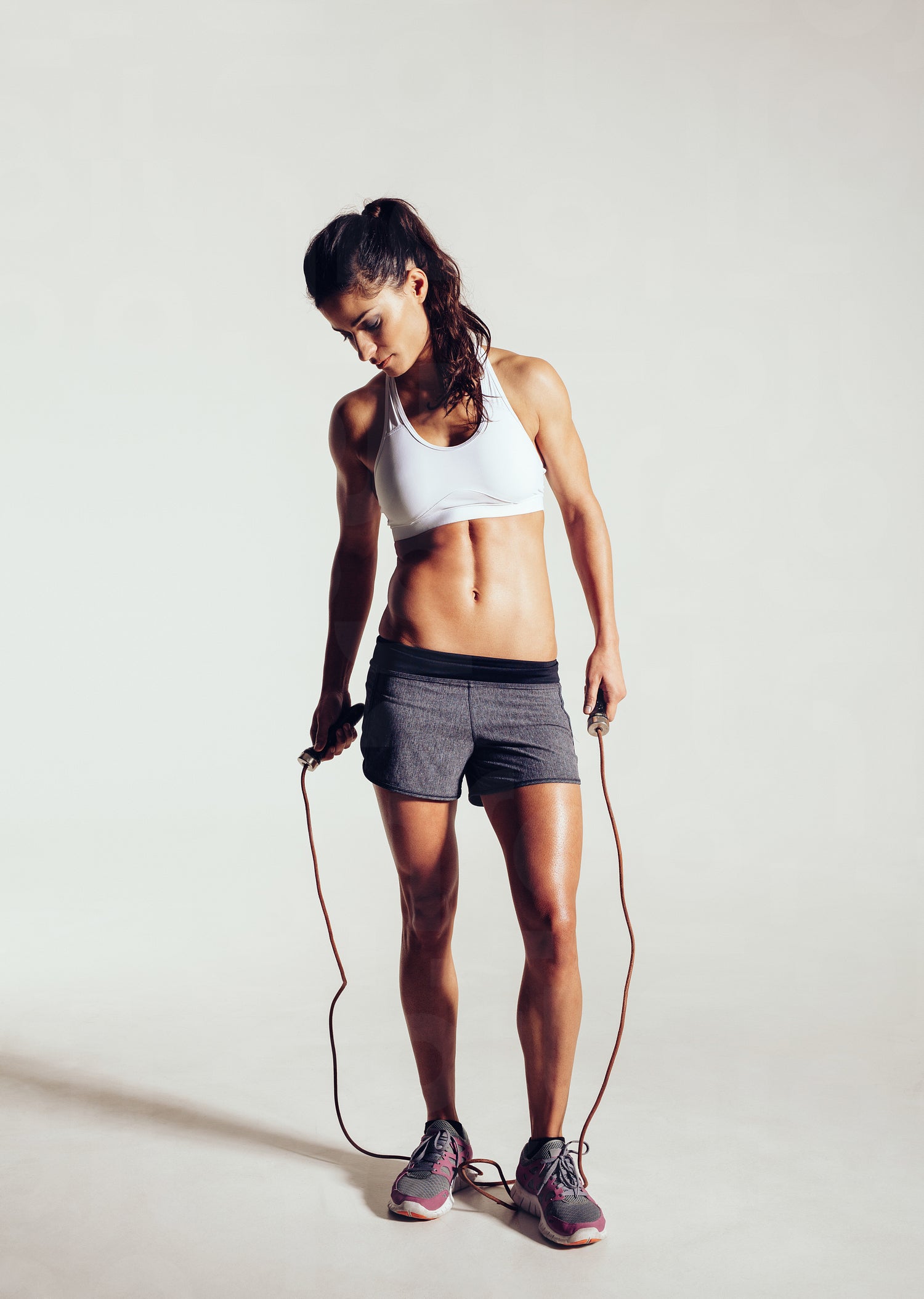 Studio shot of fit and muscular woman with jumping rope standing on grey background. Sports and fitness concept.