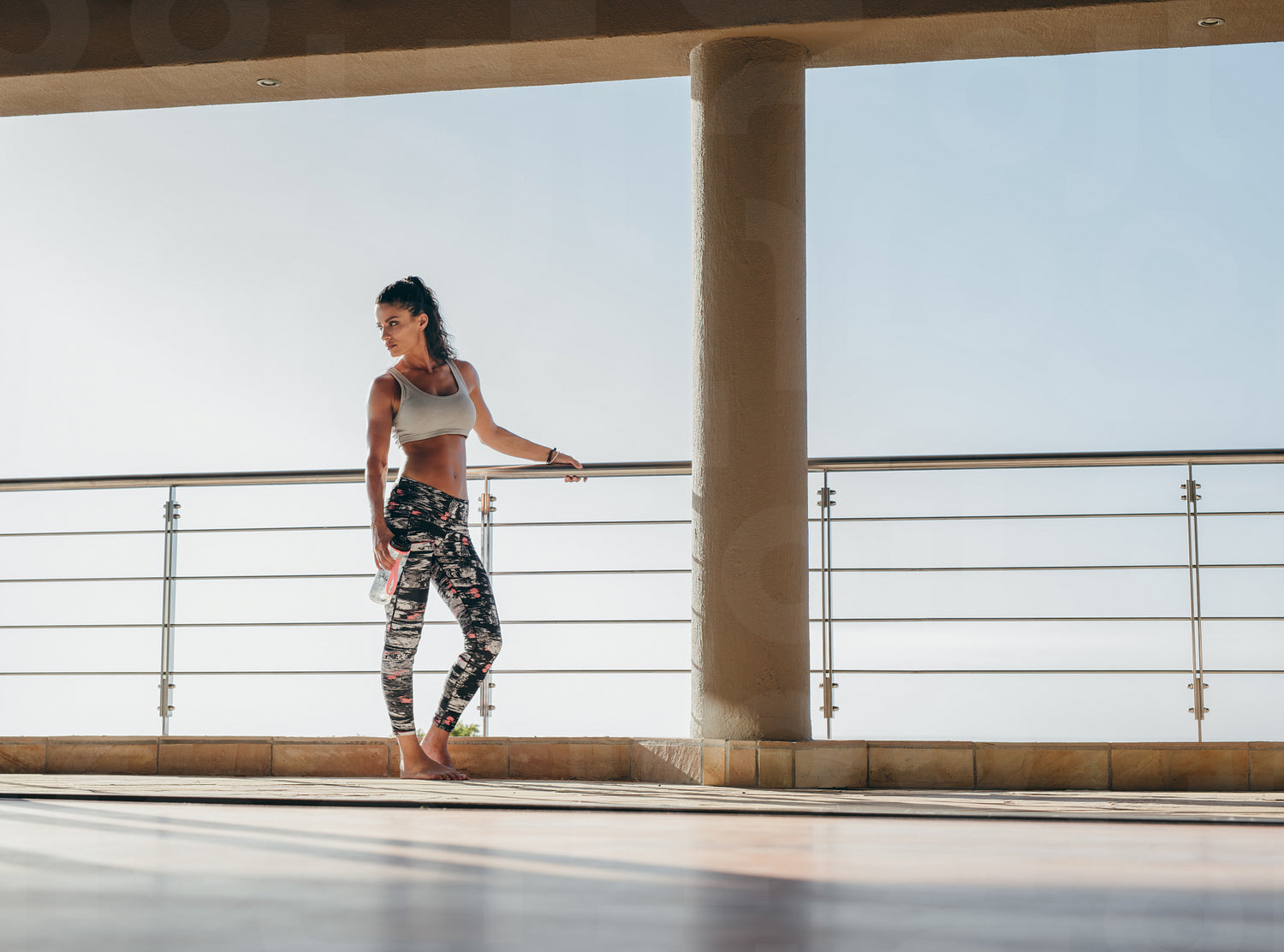 Full length shot of fit young woman standing in the balcony with a water bottle. Fitness woman taking break from exercise.
