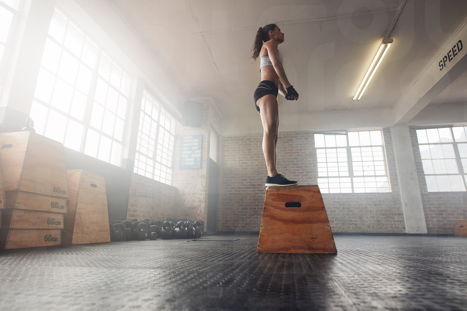 Low angle shot of fit young female model in sports wear standing on a box at gym. Muscular woman doing box jump exercise at gym.