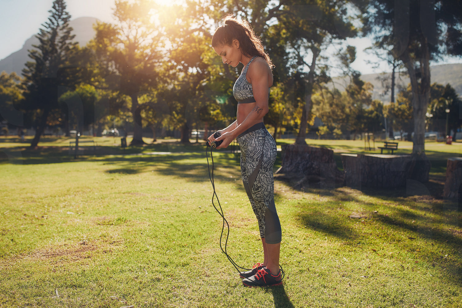 Full length shot of fit young woman with skipping rope outdoors at the park. Fitness female holding a jump rope for workout on sunny day.