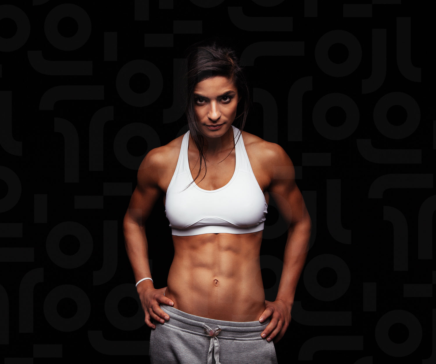 Shot of a strong woman with muscular abdomen in sportswear. Fitness female model posing on black background.