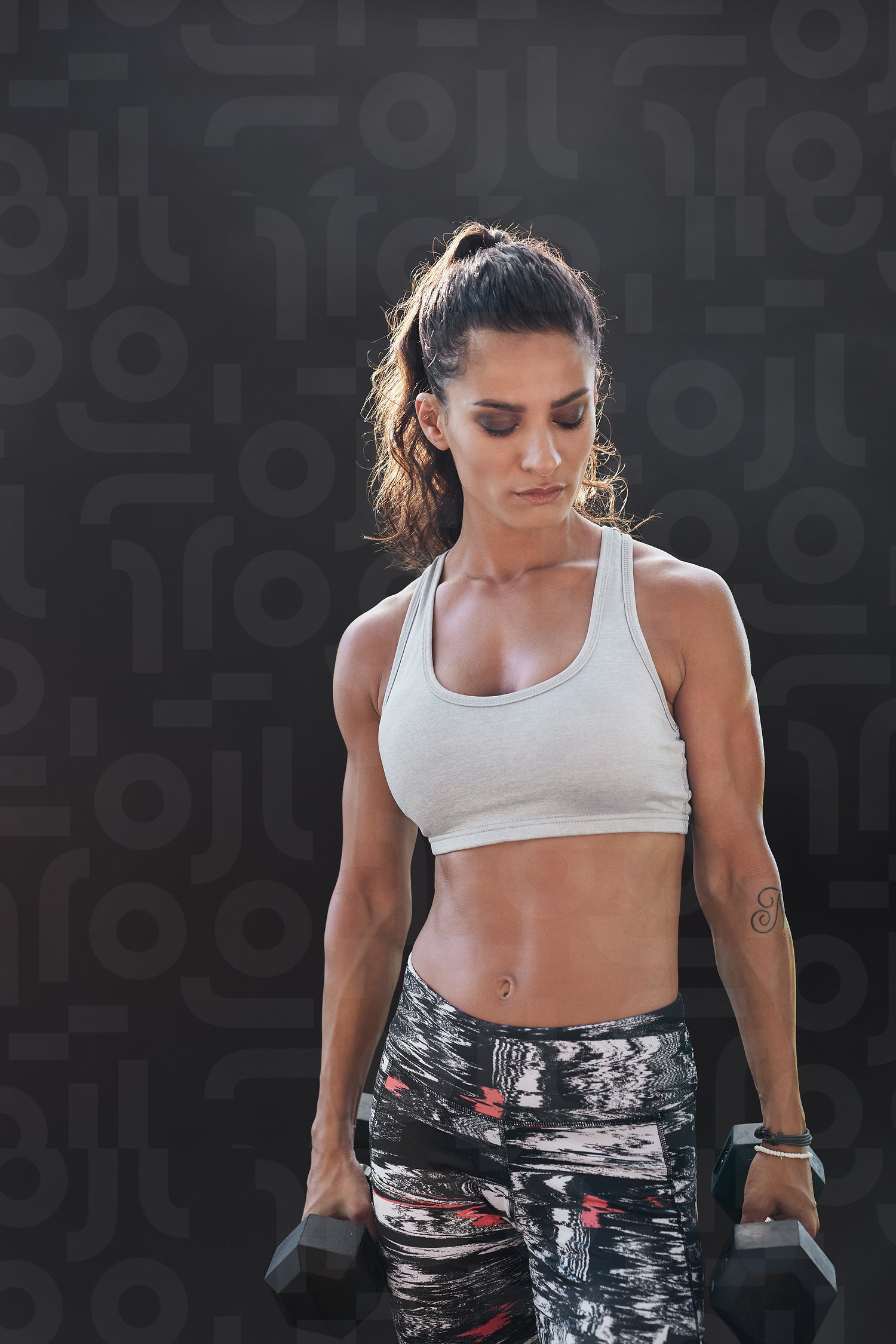 Fitness model exercising with dumbbells