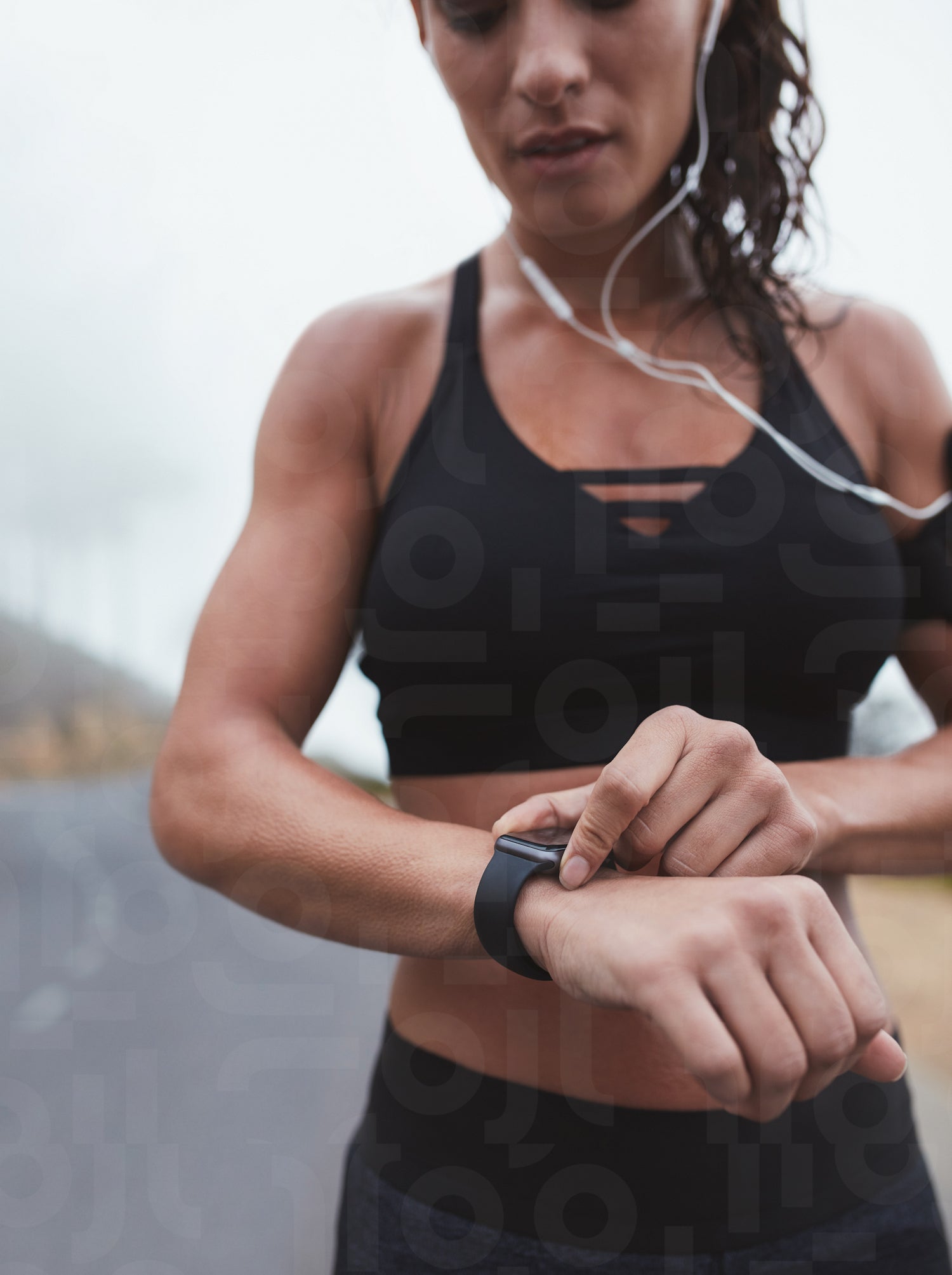 Cropped shot of fitness woman adjusting her smart watch while exercising outdoors in morning. Focus on hands of female athlete.