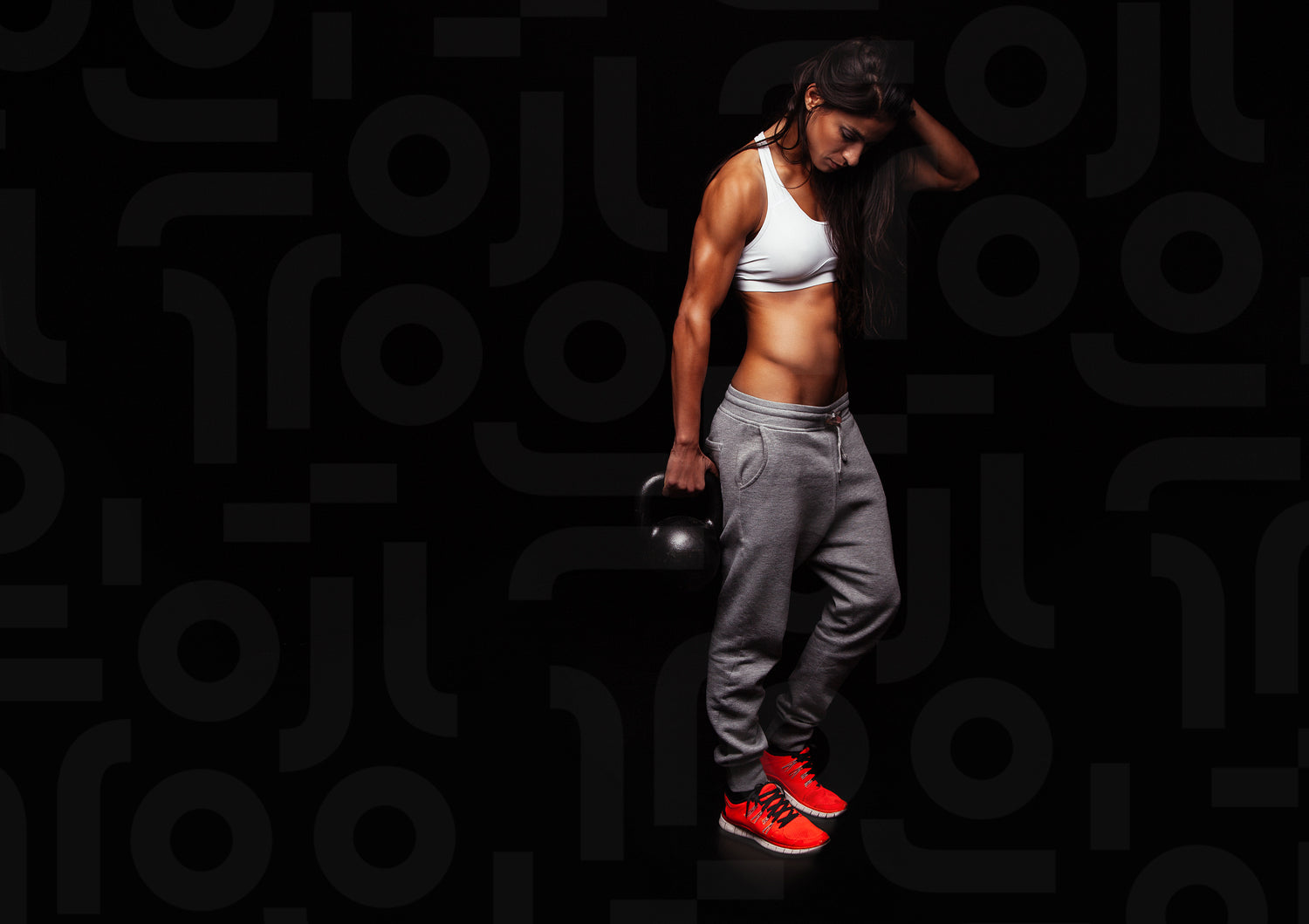 Fitness woman doing crossfit exercising with kettle bell. Fitness instructor on black background. Female model with muscular, fit and slim body.