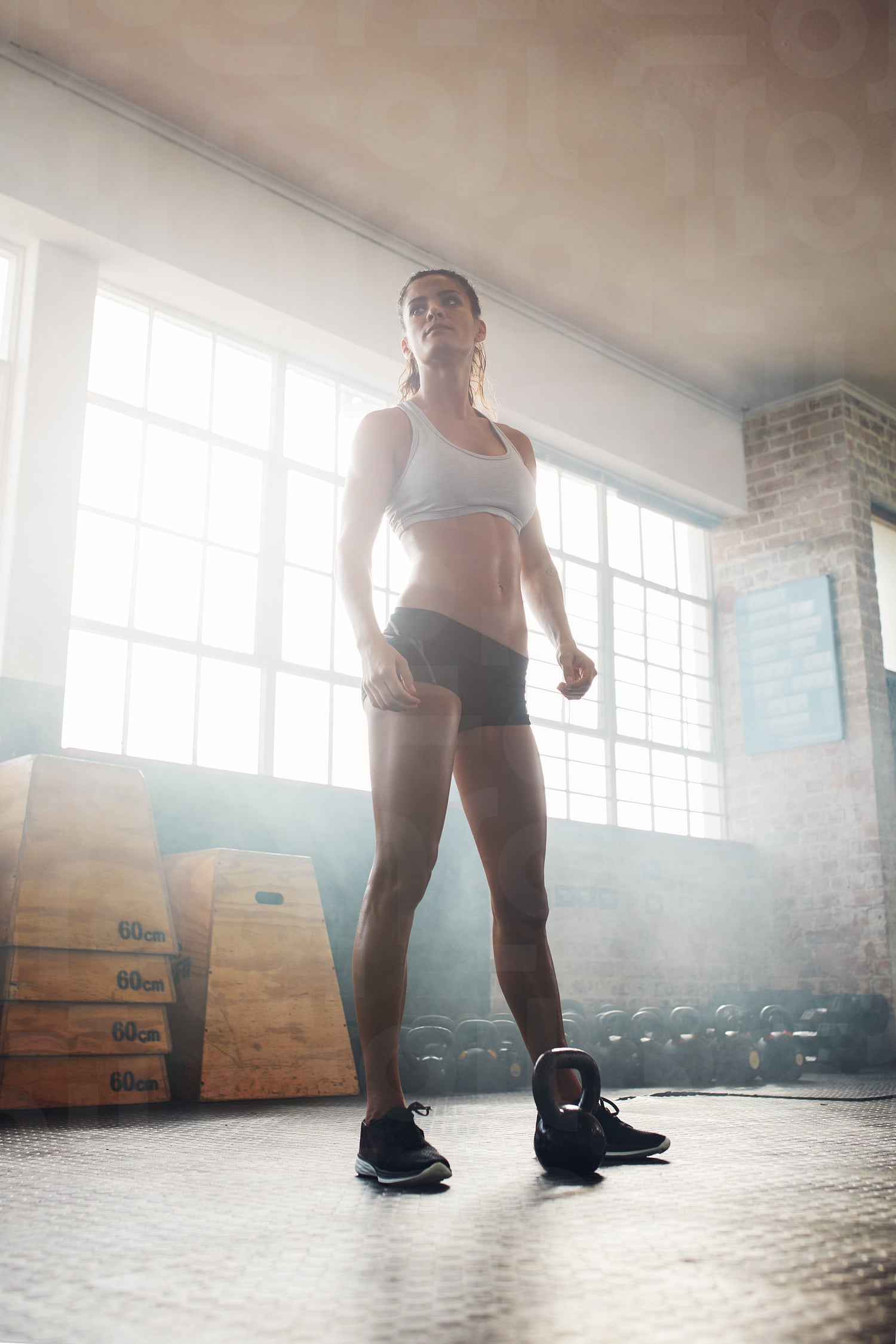 Full length shot of muscular woman standing in crossfit gym and looking away. Tough fitness female model with kettle bell on floor.