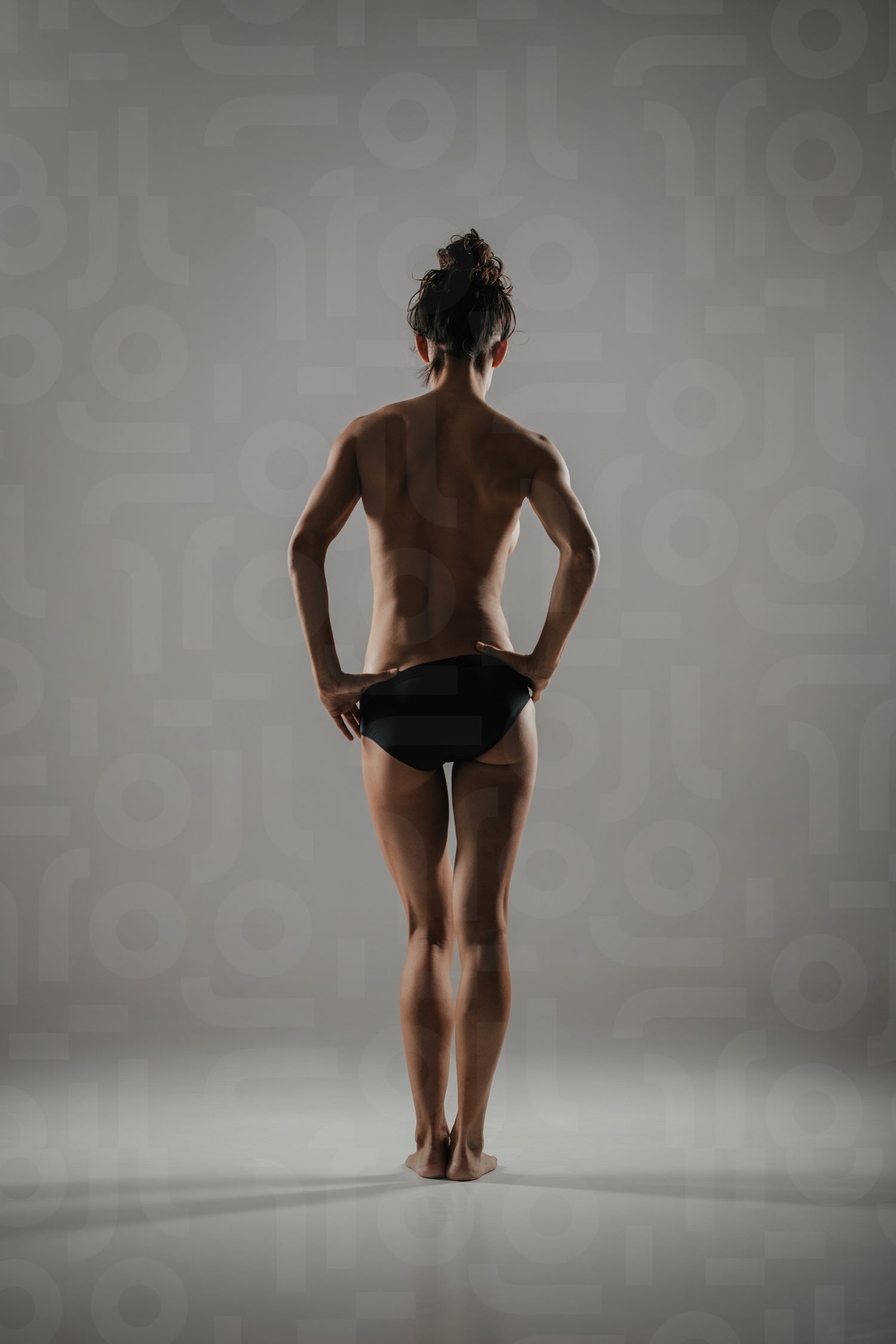Shapely fit young woman posing naked in her panties with her back to the camera side lit to enhance her curvy sexy figure, over grey
