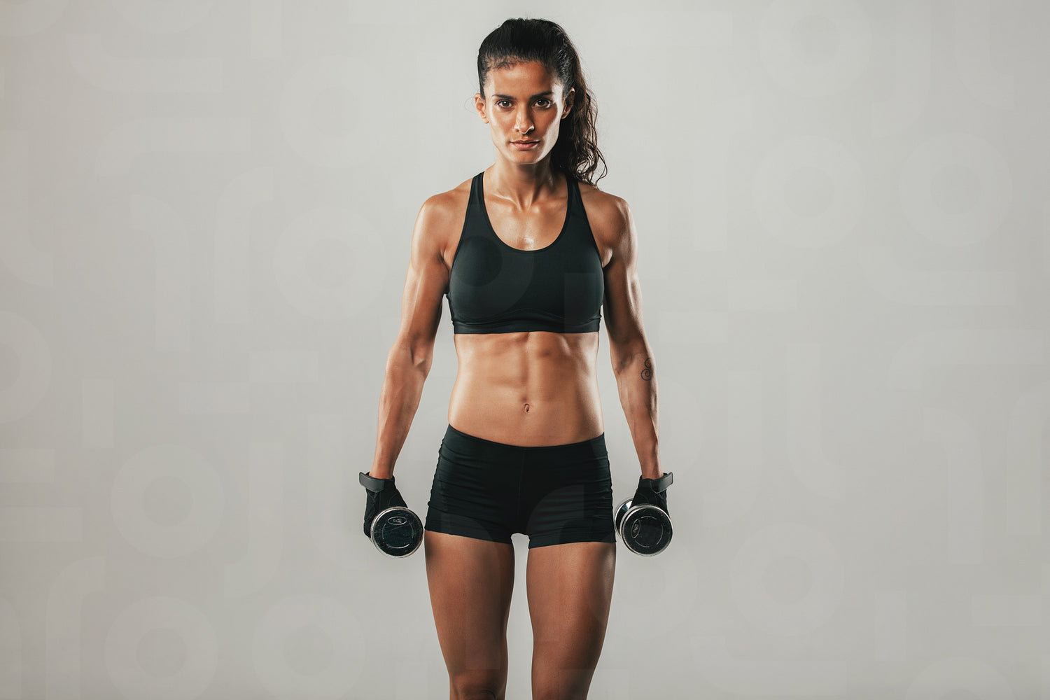 Strong woman with pair of black dumbbell weights and confident expression standing over gray background with copy space
