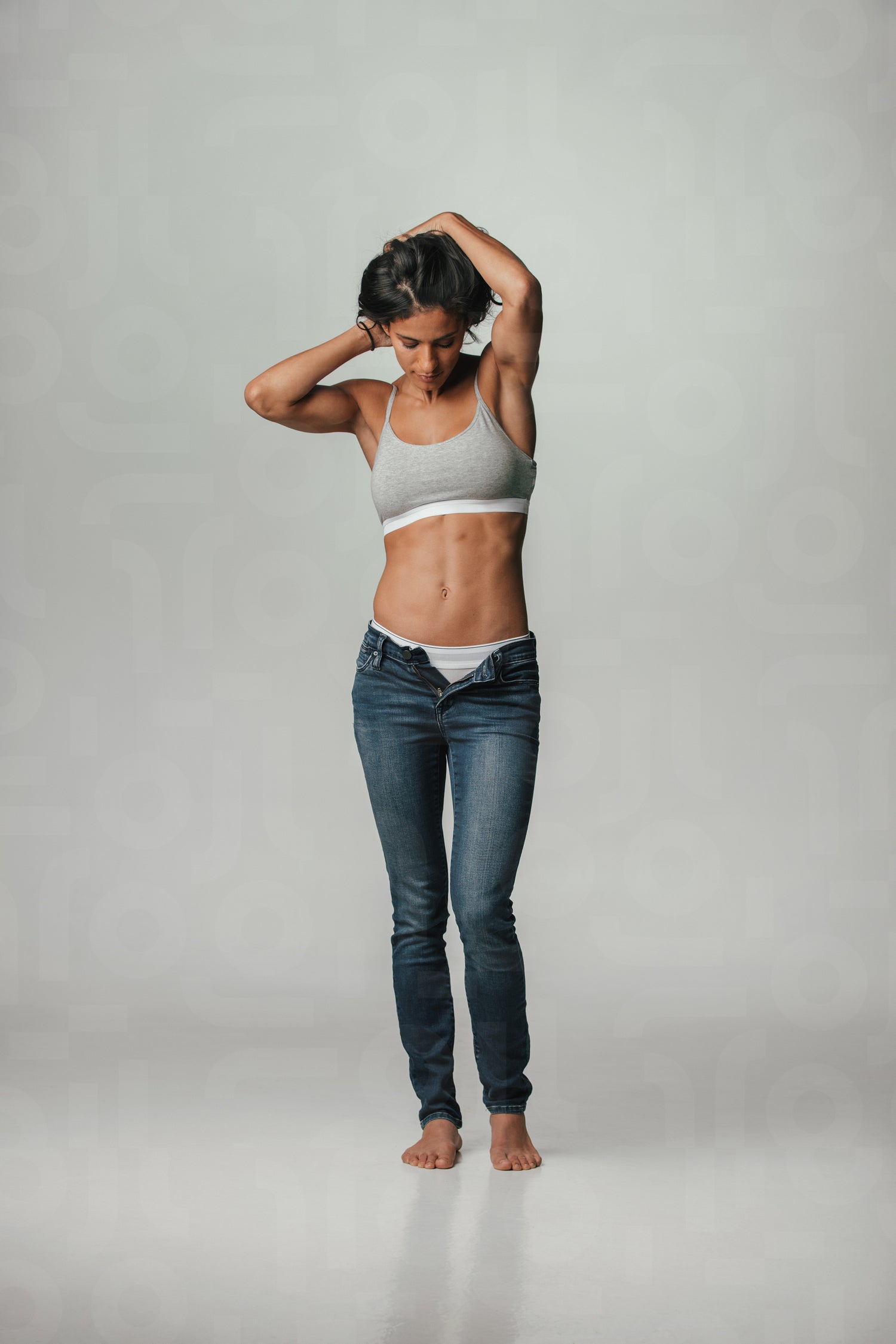 Trendy young woman posing in underwear and jeans with her zip undone to disclose her panties standing barefoot with her arms raised to her head showing her toned fit body, over grey
