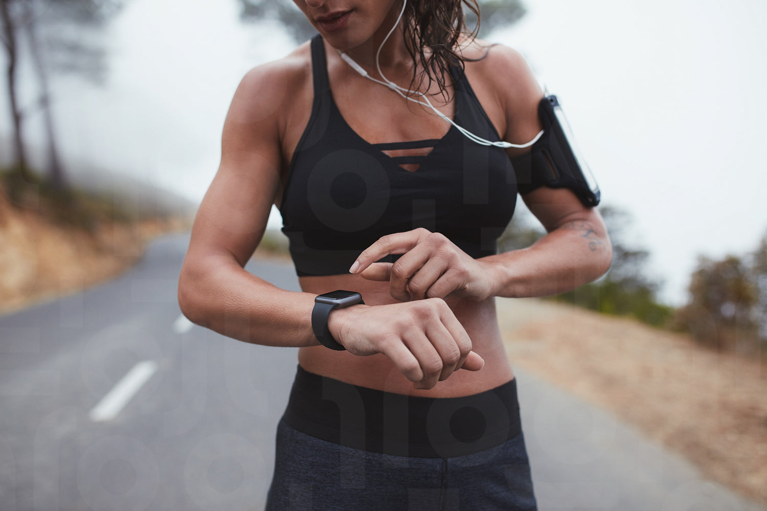 Woman adjusting her smart watch while exercising outdoors