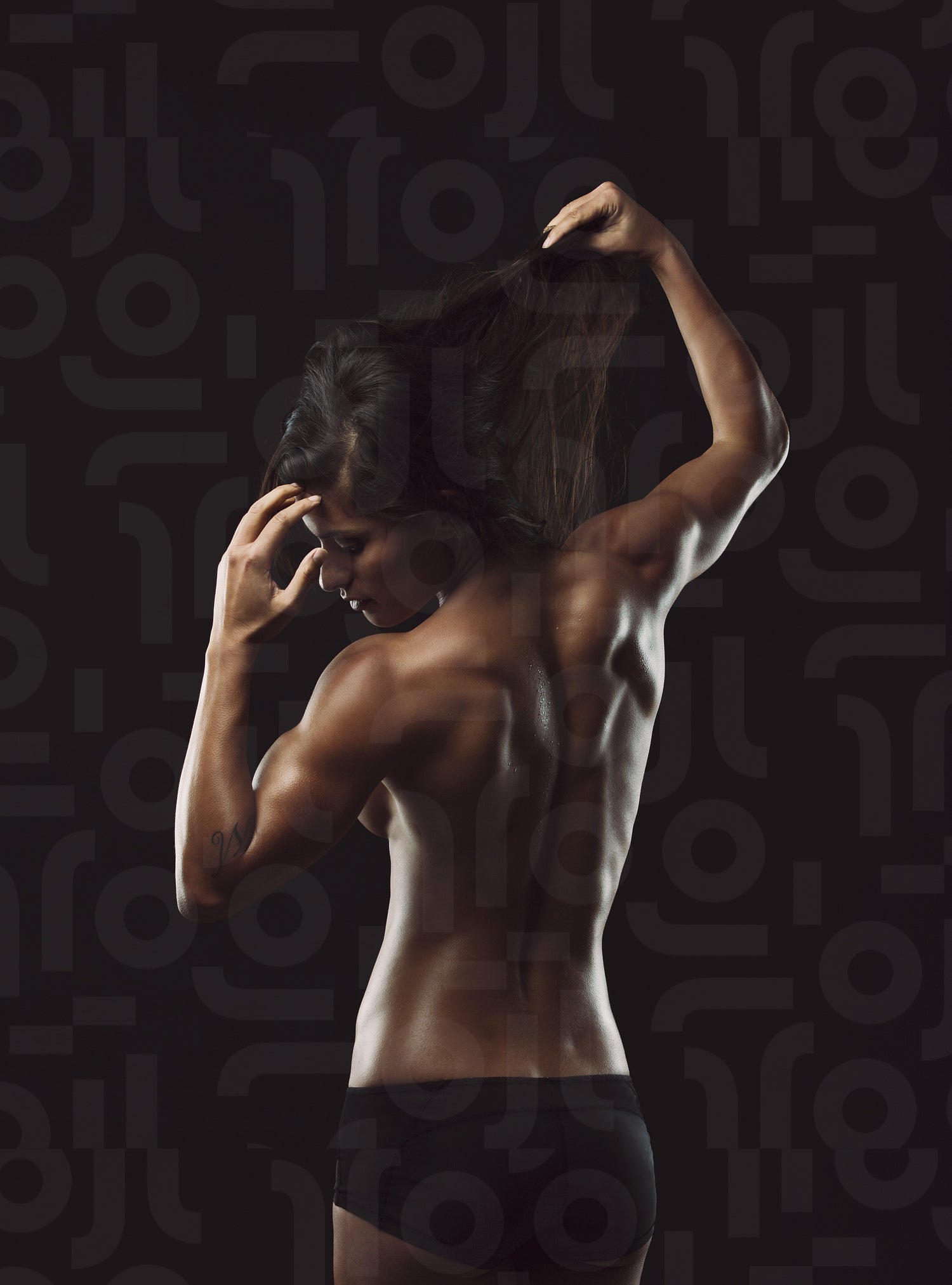 Rear view of pretty and muscular topless female bodybuilder posing on black background. Young fitness woman with perfect body.