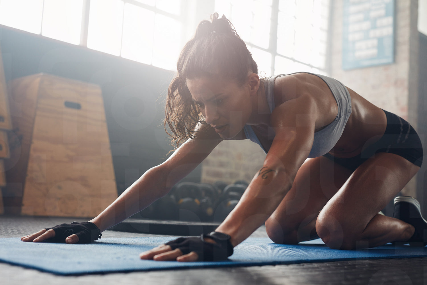 Young muscular woman doing stretching workout on fitness mat. Female performing yoga at gym.