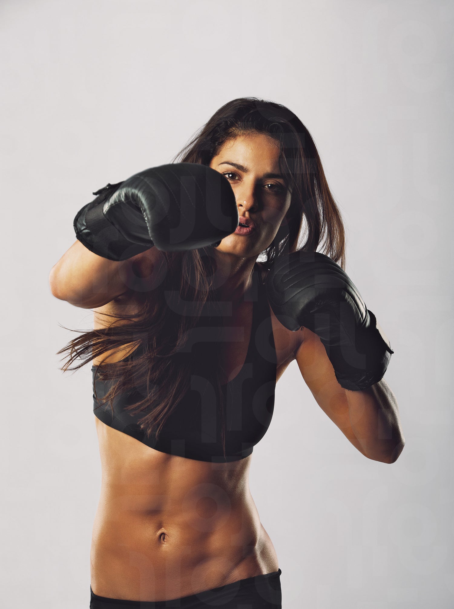 Portrait of young sports woman wearing boxing gloves training boxing. Mixed race female practicing boxing looking at camera. Female boxer throwing a punch in front against grey background.