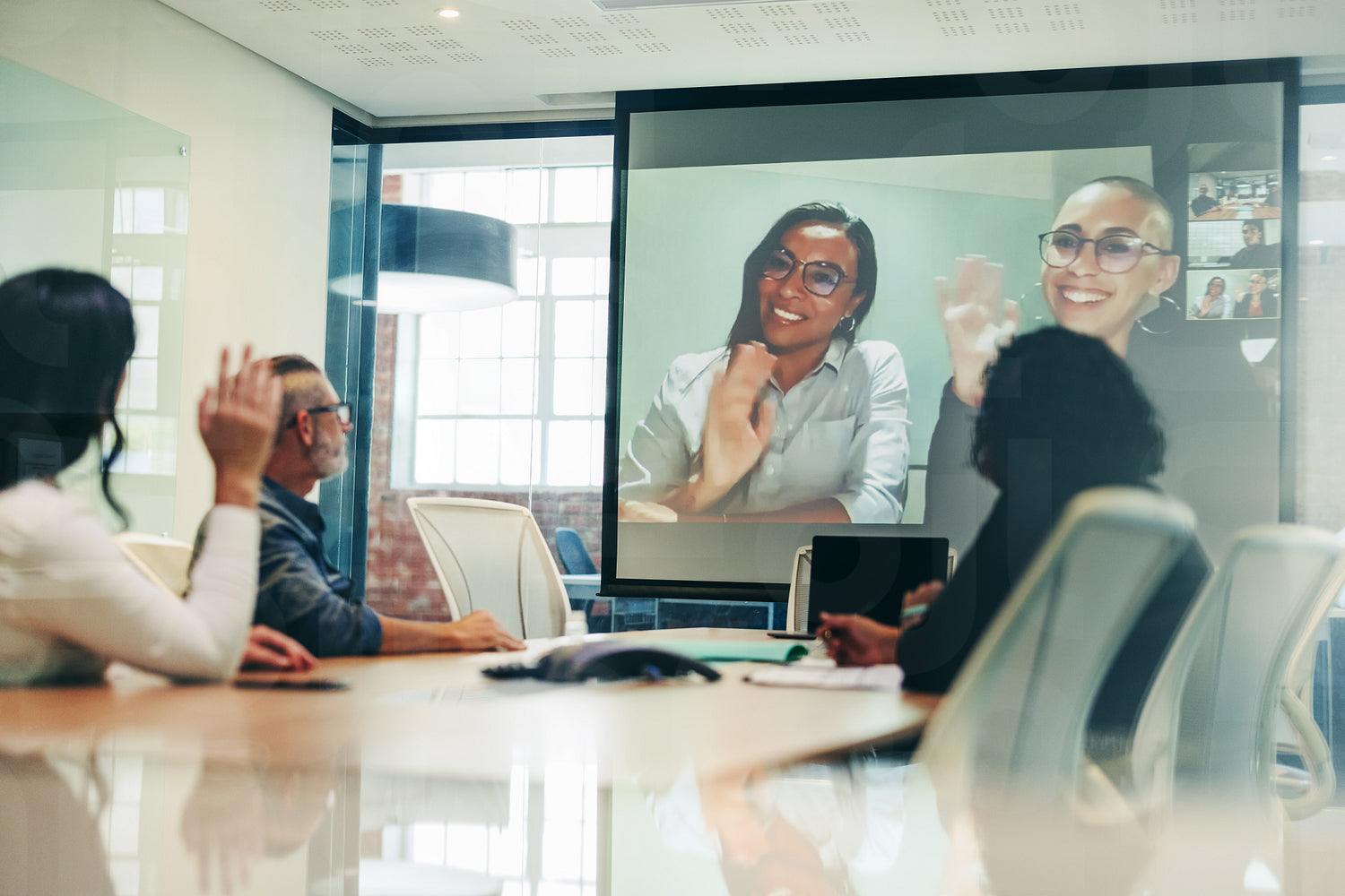 Team of colleagues greeting their business associates during a virtual meeting