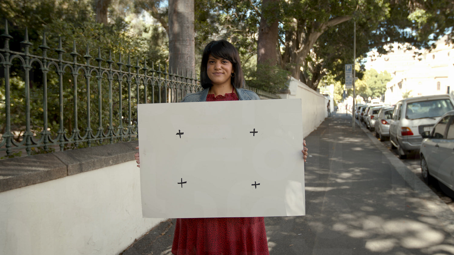 Woman in causals standing with a blank billboard sheet. Female standing on the sidewalk holding a empty placard.