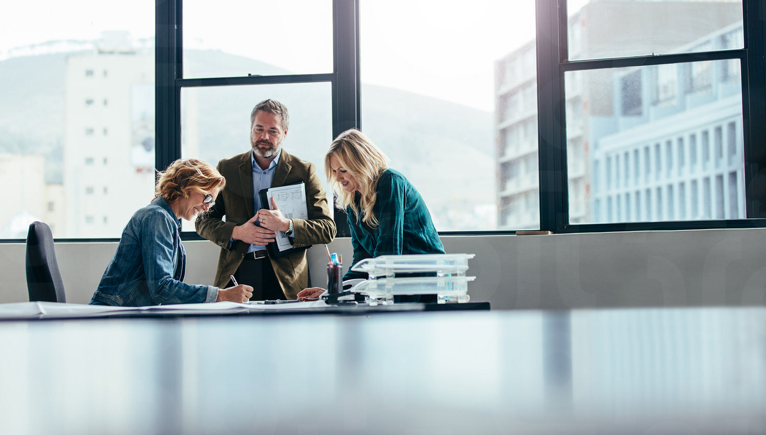 Business team working together in office. Team of three businesspeople discussing building plans in meeting.
